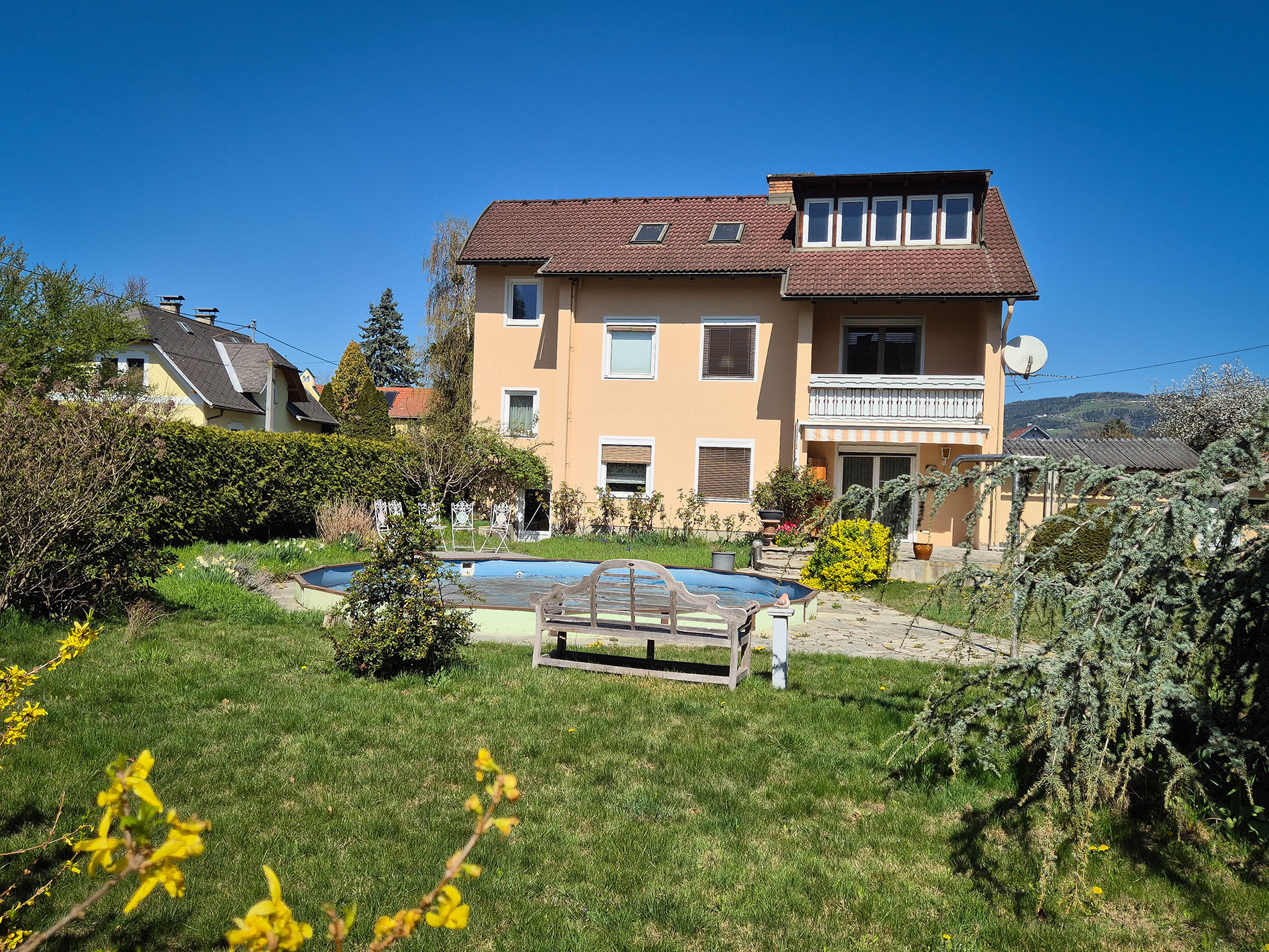 Der Baukörper wurde laufend gepflegt und befindet sich in gutem Zustand. Der vorhandene Baukörper aus den 70er- Jahren wurde 1996 um einen gediegenen Zubau erweitert. Auch das Dach und die Fenster wurden im Zuge des Zubaus erneuert, die technische Ausstattung ist gut in Schuss. Eine Öl- Zentralheizung sorgt für behagliche Wärme in den kälteren Monaten, zusätzliche Kamin- Anschlüsse sind vorhanden. Der Swimmingpool im Außenbereich bietet Erfrischung und Entspannung, bedarf allerdings wieder etwas Zuwendung um wieder in vollem Glanz zu erstrahlen.